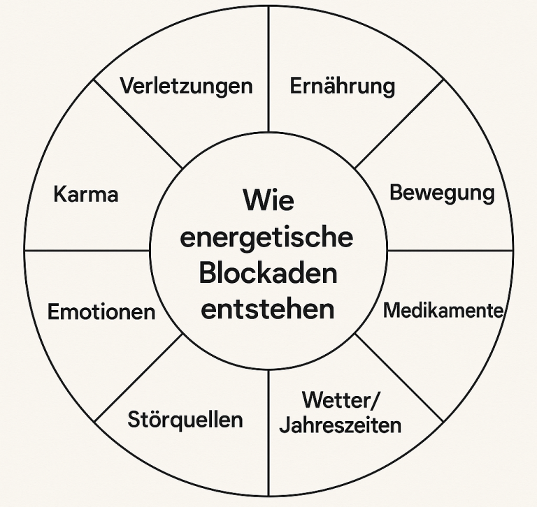Der Energiefluss in unserem Organismus ist empfindlich und kann durch eine ganze Reihe äußerer und innerer Einflüsse gestört werden. Zu den häufigsten Ursachen von energetischen Blockaden gehören Emotionen. Zorn, Wut, Sich-Sorgen, Trauer und Depression aber auch übermäßige Freude und Angst stören den Energiefluss, insbesondere in den unterschiedlichen Organen. Auch falsche Medikamente und die Nebenwirkungen von Medikamenten können im Organismus große Probleme nach sich ziehen und insbesondere den Stoffwechsel und die Entgiftung stören. Eine falsche oder unausgewogene Ernähung kann wie auch toxische Substanzen zu diversen Blockaden führen. Leber, Magen, Milz und auch der können mit Störungen reagieren.