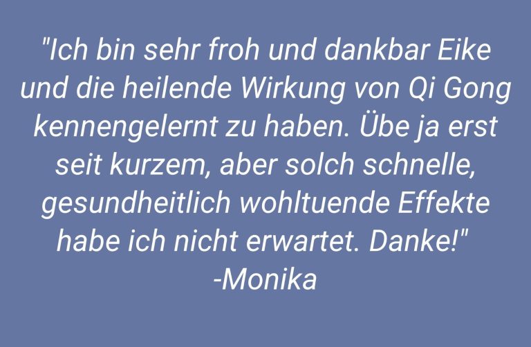 Viele Teilnehmende berichten von einem gesteigerten Wohlbefinden, einer besseren emotionalen Balance, ruhigerem Schlaf und Überwindung ihrer individueller Herausforderungen. Die regelmäßige Praxis fördert Achtsamkeit und schafft Raum für inneren Frieden. Erfahre hier mehr über die gesundheitlichen Wirkungen von Qi Gong.